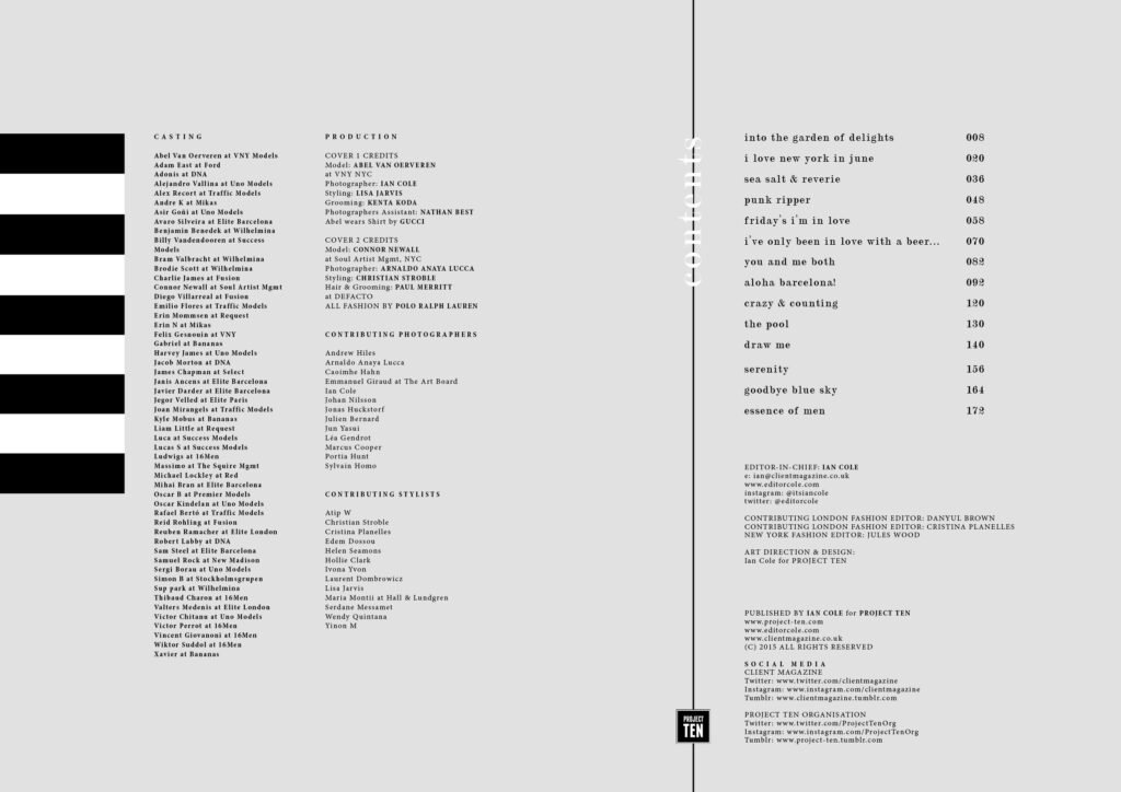The 1st cover of CLIENT #15 features Abel Van Oeveren at VNY Models by Ian Cole. Abel wears Gucci on the cover, styled by Lisa Jarvis. Hair & grooming by Kenta Koda with photo assistant Nathan Best. The 2nd cover features top newcomer Connor Newall at Soul Artist Mgmt by Arnaldo Anaya Lucca. Connor wears total-look Polo Ralph Lauren throughout the cover story, styled by Christian Stroble with hair by Paul Merritt. The print edition comes with a 8″x 8″ limited edition print, and global shipping is included in the price. Published by Ian Cole (June 2016).