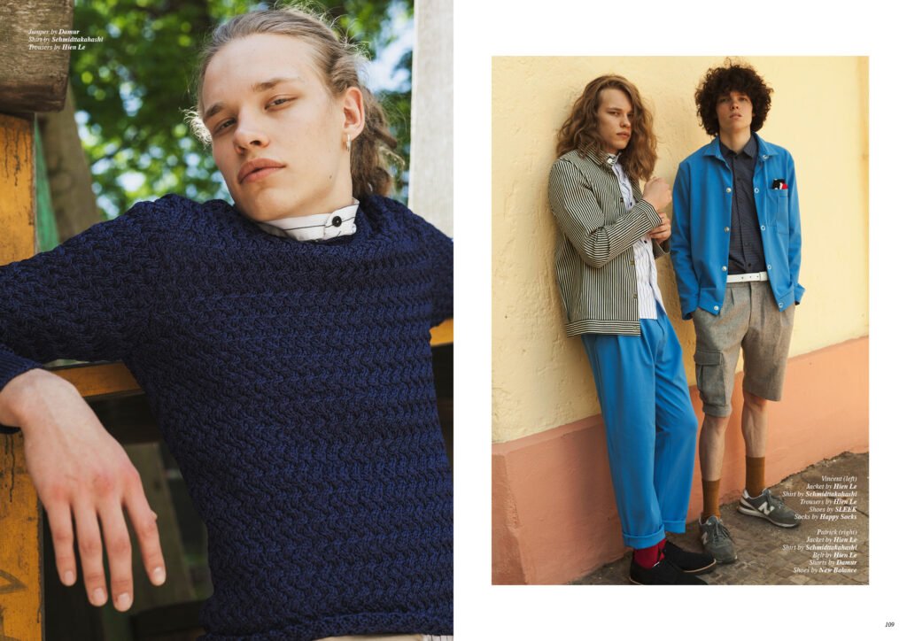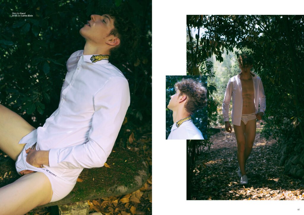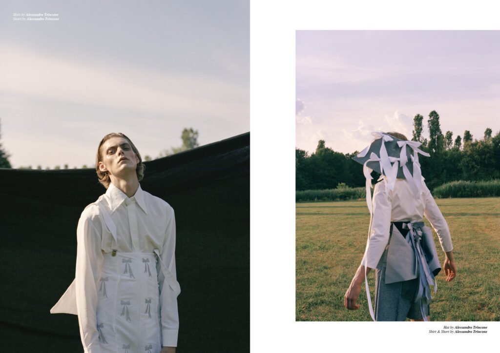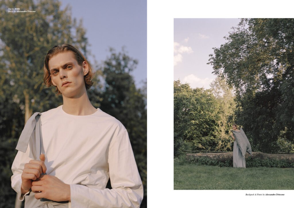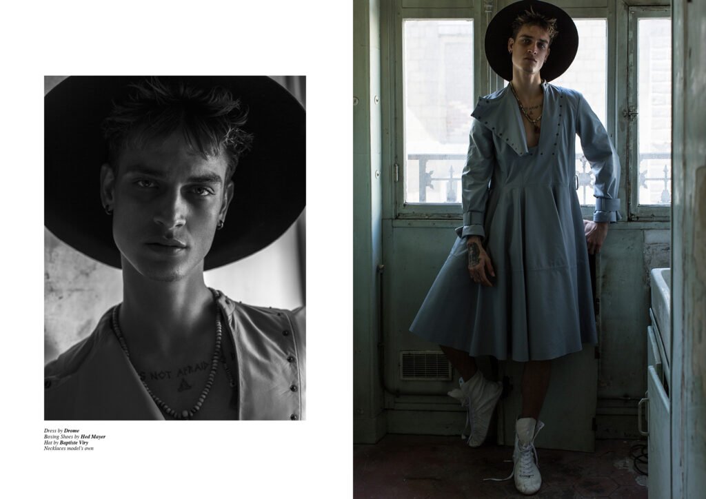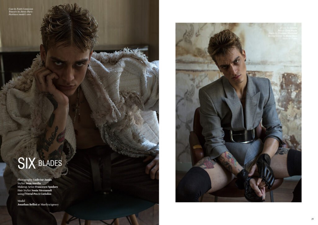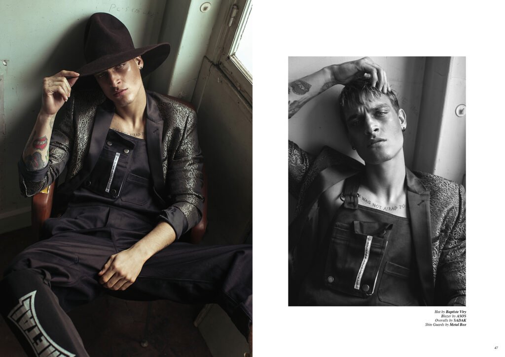 On the back cover, we see Brazilian Jonathan Bellini at Marilyn Agency (Paris) photographed by Ludivine Jamin and styled by Séna Aurélia. Jonathan wears Shirt, Trousers, Socks & Shoes by Lanvin plus Cap by Beechfield. Hair by Sonia Messaoudi using l’Oréal Pro &Corioliss and makeup by Francesco Spadaro.